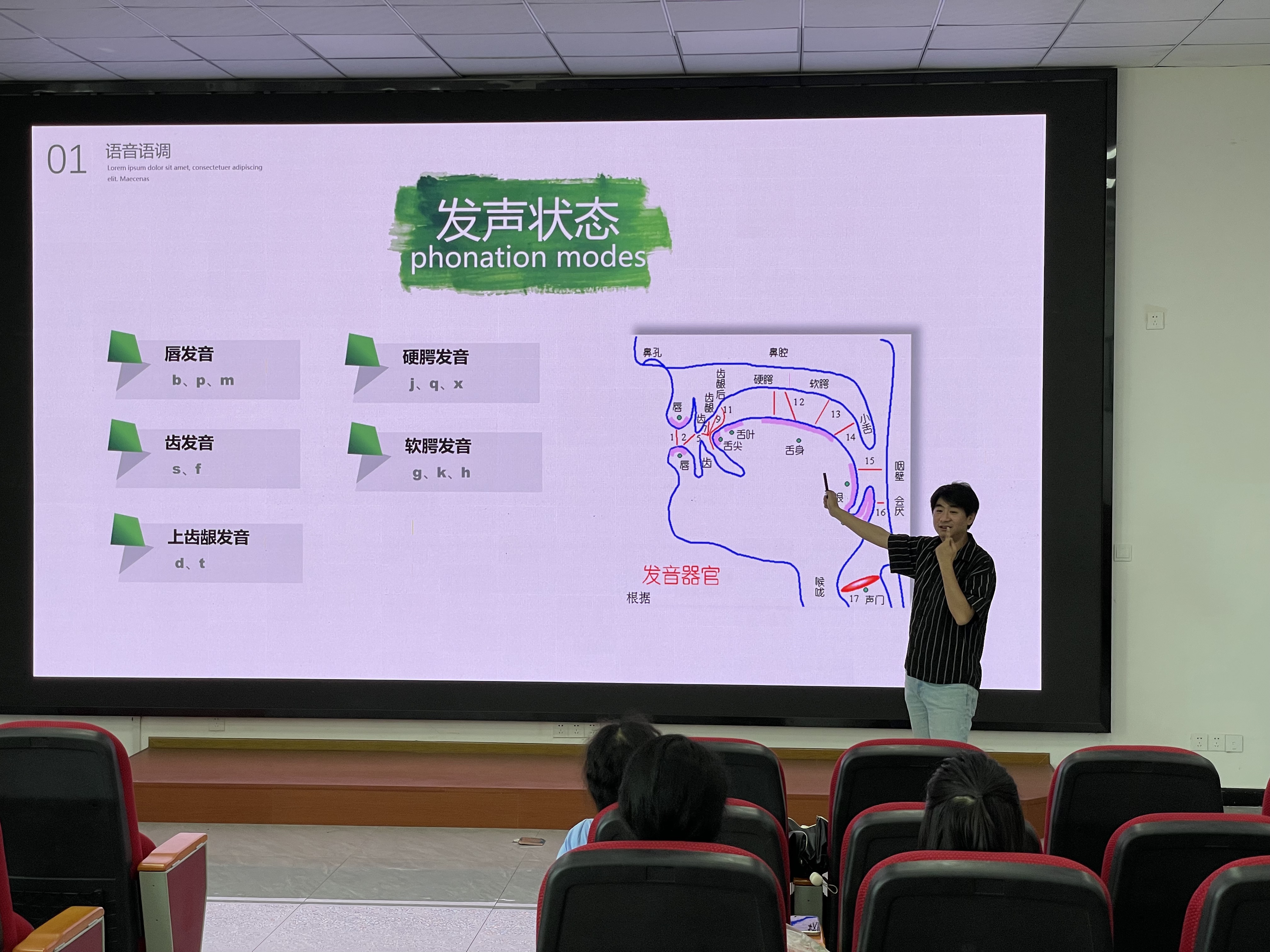 本次讲座由经济管理学院党总支副书记江劲老师主讲。他分别从不同角度阐述了沟通中声音表达的重要性以及如何找到属于自己的声音。首先,从语言的准确性方面,江老师指出,当今阻碍人们发音标准的问题主要是声母韵母归声调值和轻重格的错误运用,并传授了如何正确区分声母韵母等经验与方法。其次,如何找到属于自己的声音,江老师提出,正常的说话是我们对语言表达的一种追求,更需要下功夫。他提出“用气发声”的方法,鼓励用气发声“给声音装潢”,通过生动的案例讲解,帮助同学们更好地理解运用。