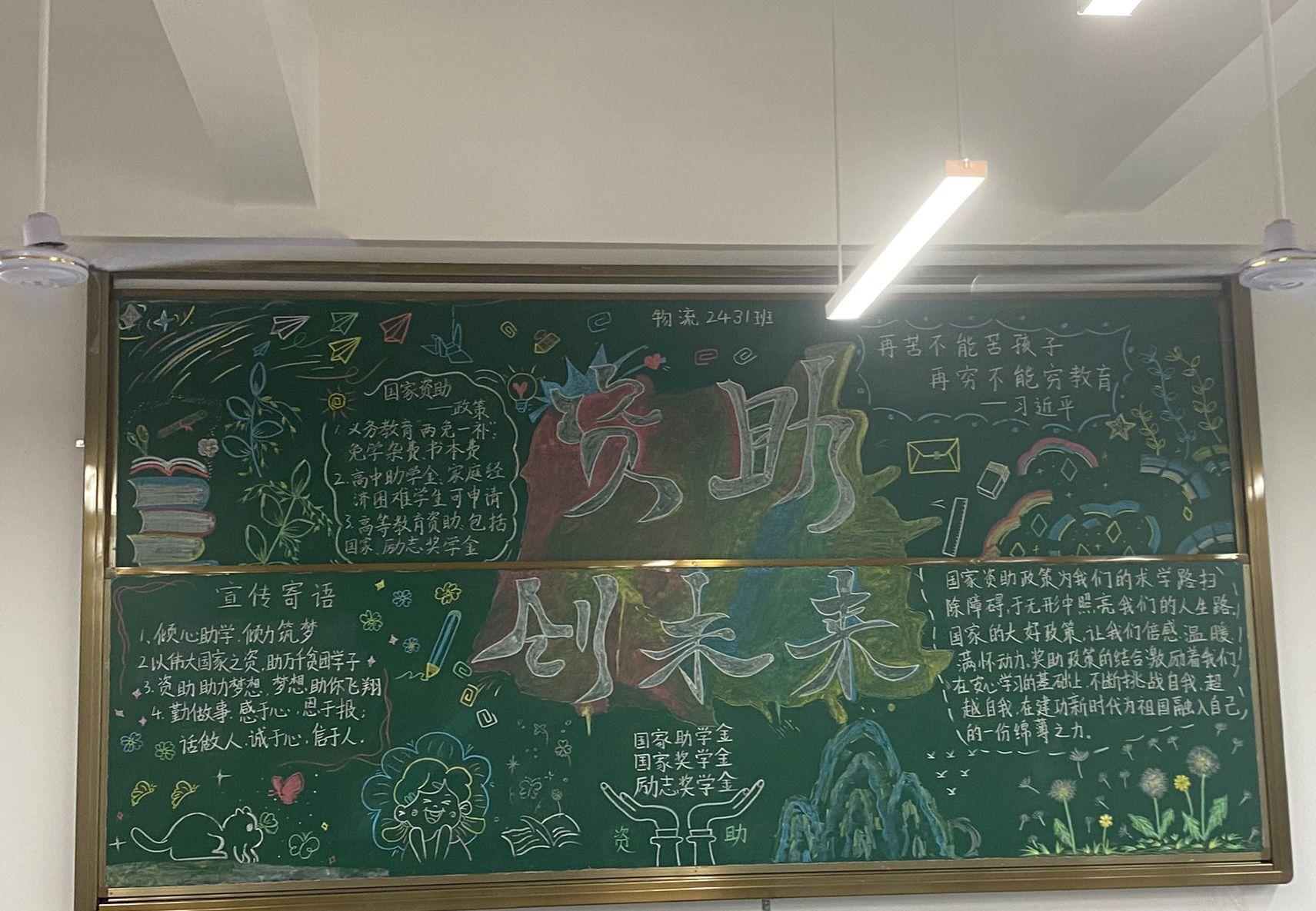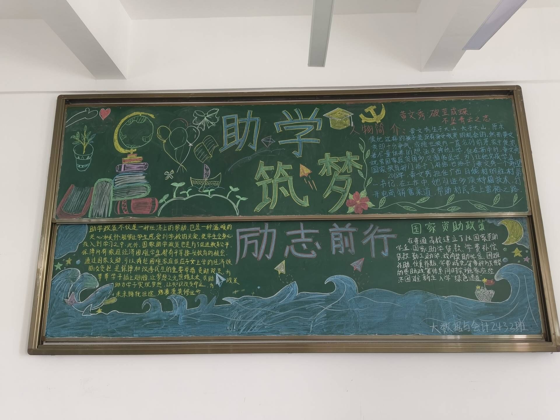 活动期间,各班级围绕“助学筑梦”主题精心设计黑板报。同学们以粉笔为画笔,以黑板为画布,通过图文结合的形式传递温暖与力量:在政策解读板块:部分班级以插画形式呈现国家奖学金、励志奖学金的申请流程,用漫画情景再现助学贷款办理场景,直观展现政策如何为学子铺就求学之路;在励志分享板块:多个班级摘录优秀受助学生的奋斗故事,并张贴班级同学手写的感恩标语。