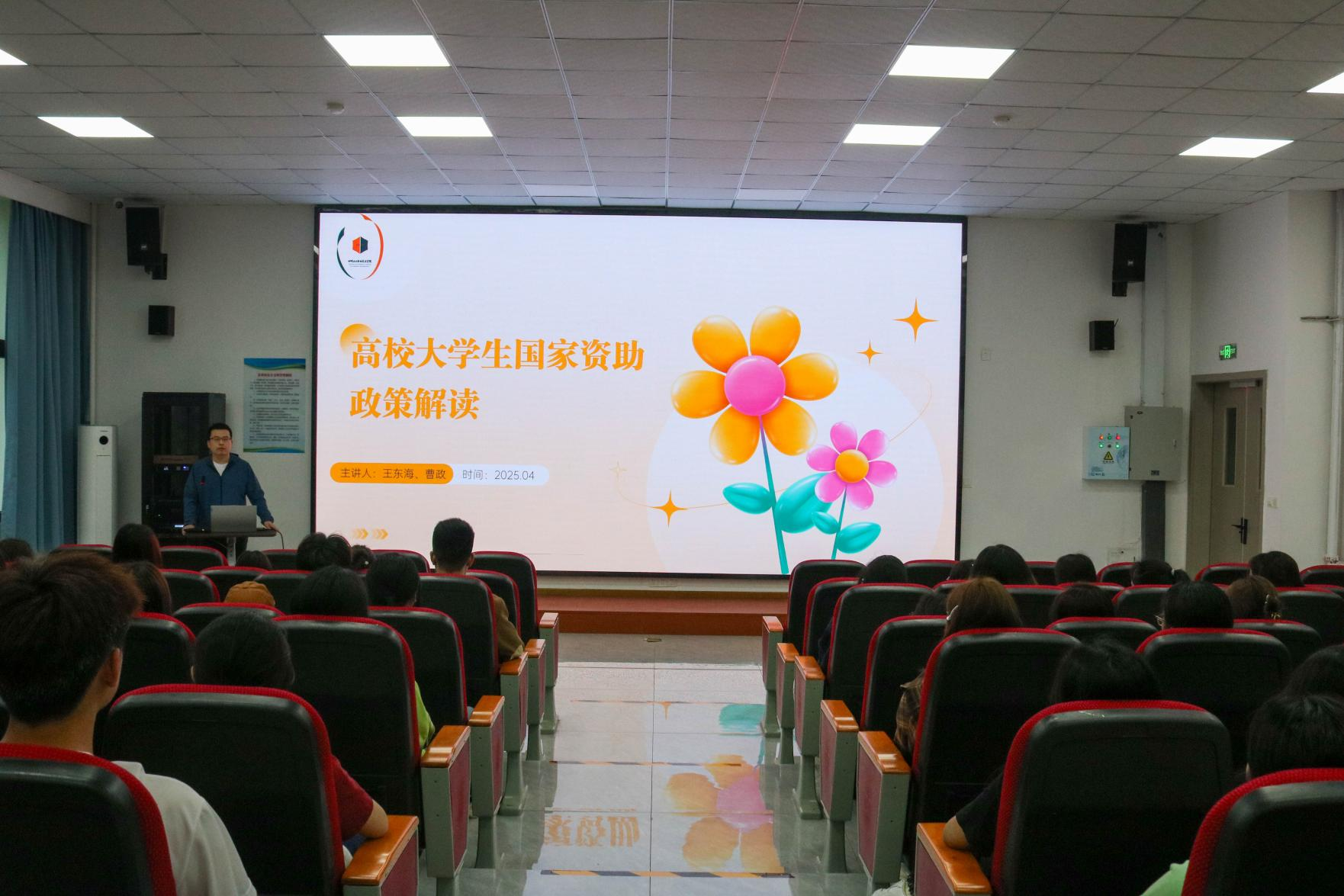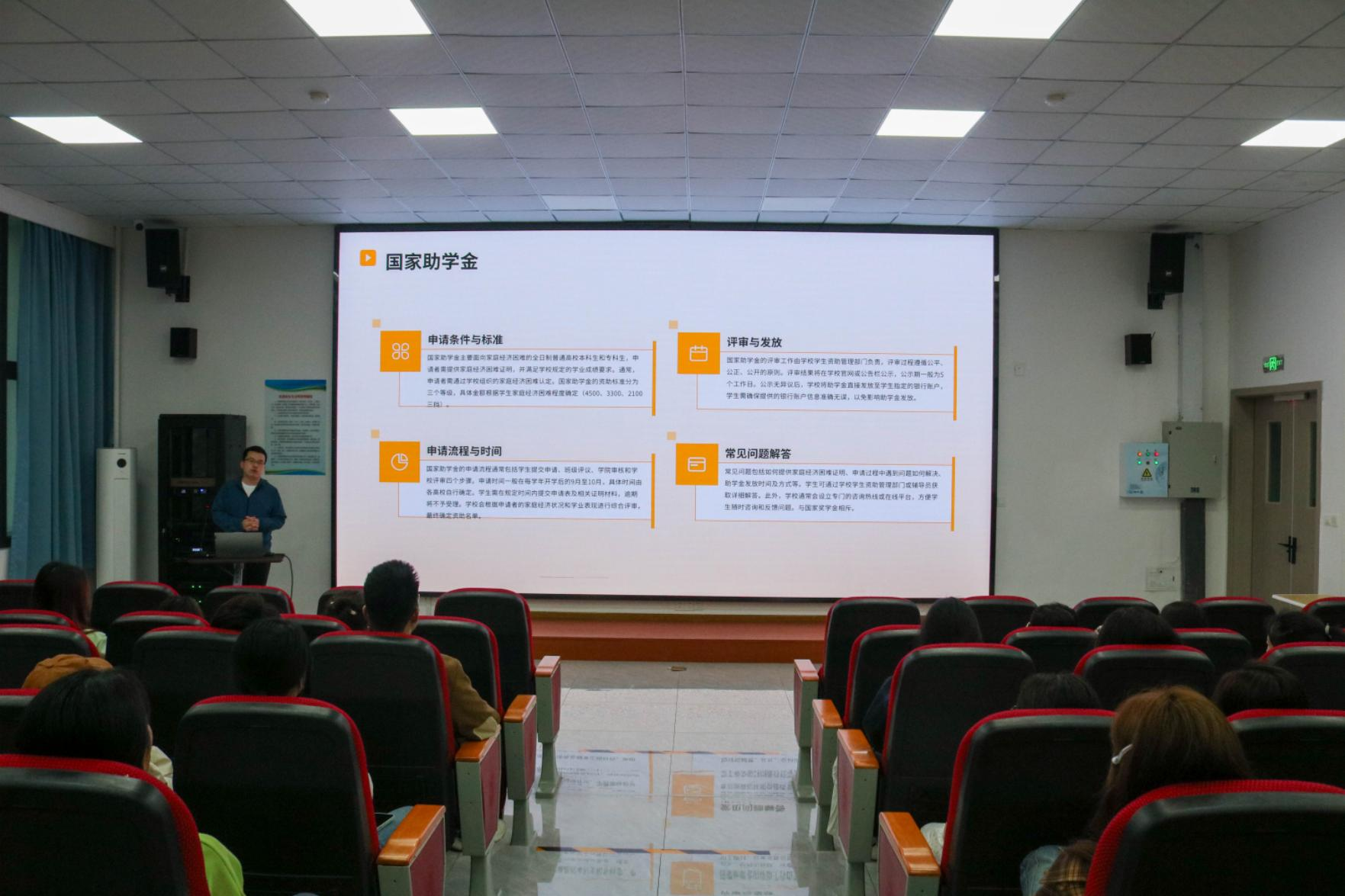 活动中,王东海老师系统讲解了详细解读高校大学生国家资助政策,对国家助学金申请条件与流程、生源地信用助学贷款政策要点进行说明,并详细解读了退役学生学费补偿及国家助学贷款代偿政策,帮助同学们明晰政策覆盖范围与申报方式。在奖学金方面,从国家奖学金到励志奖学金、学校奖学金,王老师逐一深入解读,他强调,这些奖学金不仅是经济上的支持,更是对同学们努力学习的肯定与鼓励。此外,王老师还介绍了学校勤工助学岗位的设置、申请渠道及权益保障,鼓励学生通过实践提升综合能力。