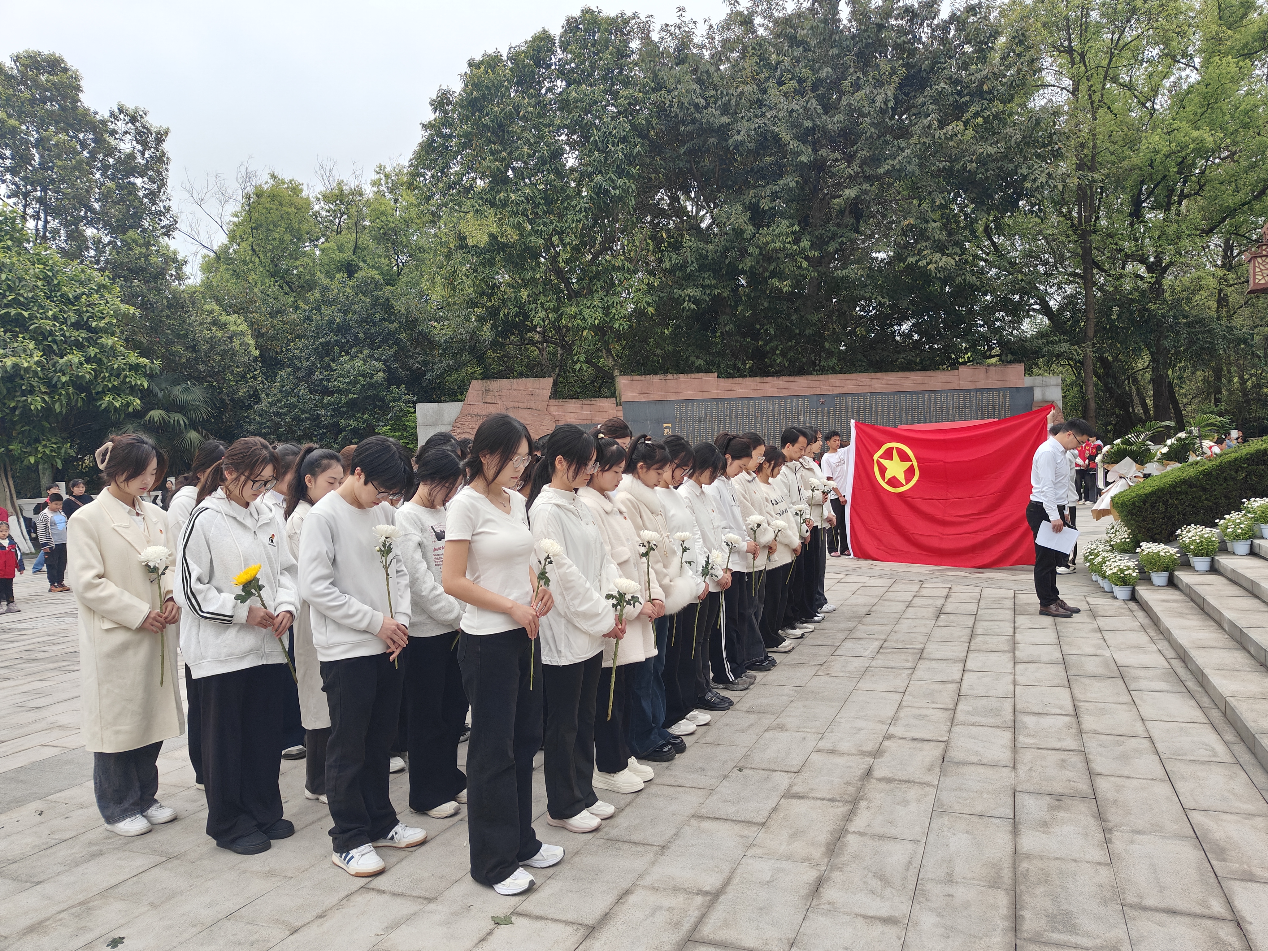 在庄严肃穆的烈士陵园,全体人员面向革命烈士纪念碑齐声高唱国歌,歌声回荡在苍松翠柏间,传递着对英烈们的深切缅怀。在烈士纪念碑前,全体人员肃立默哀,向先烈三鞠躬,敬献花束,以示最高的敬意和深切的哀悼,深沉的静默中,先烈们的英勇事迹仿佛穿越时空,叩击着每一位青年的心扉。