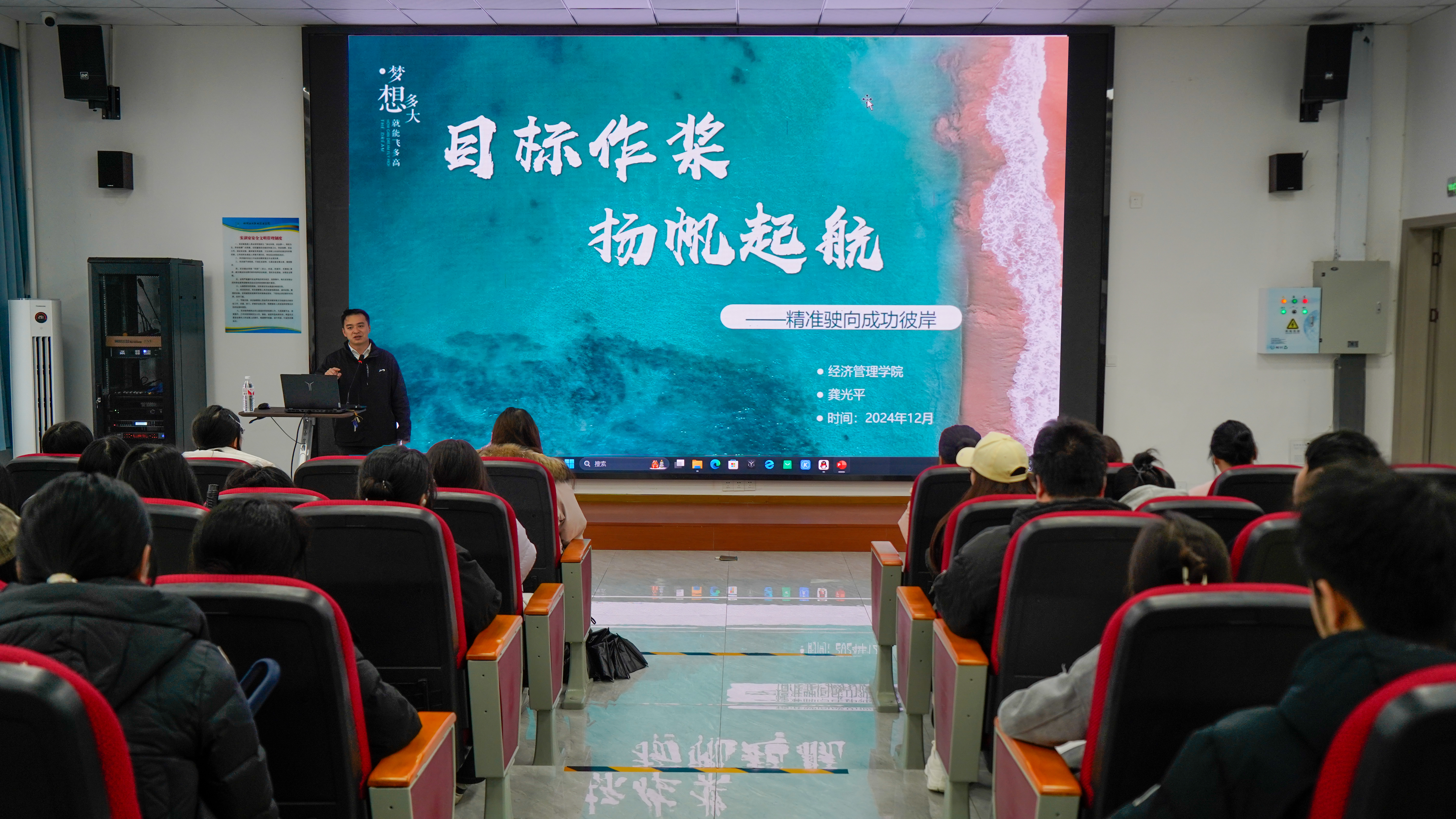 2024年12月25日,经济管理学院于醇雅楼102教室成功举办了“目标作桨,扬帆起航—精准驶向成功彼岸”主题讲座活动。活动特别邀请经济管理学院专职辅导员龚光平老师作为主讲人对学生生涯奖项细则和学生目标发展进行解读。此次活动旨在充分发挥奖励机制的激励与引导作用,助力广大青年学生成长成才。