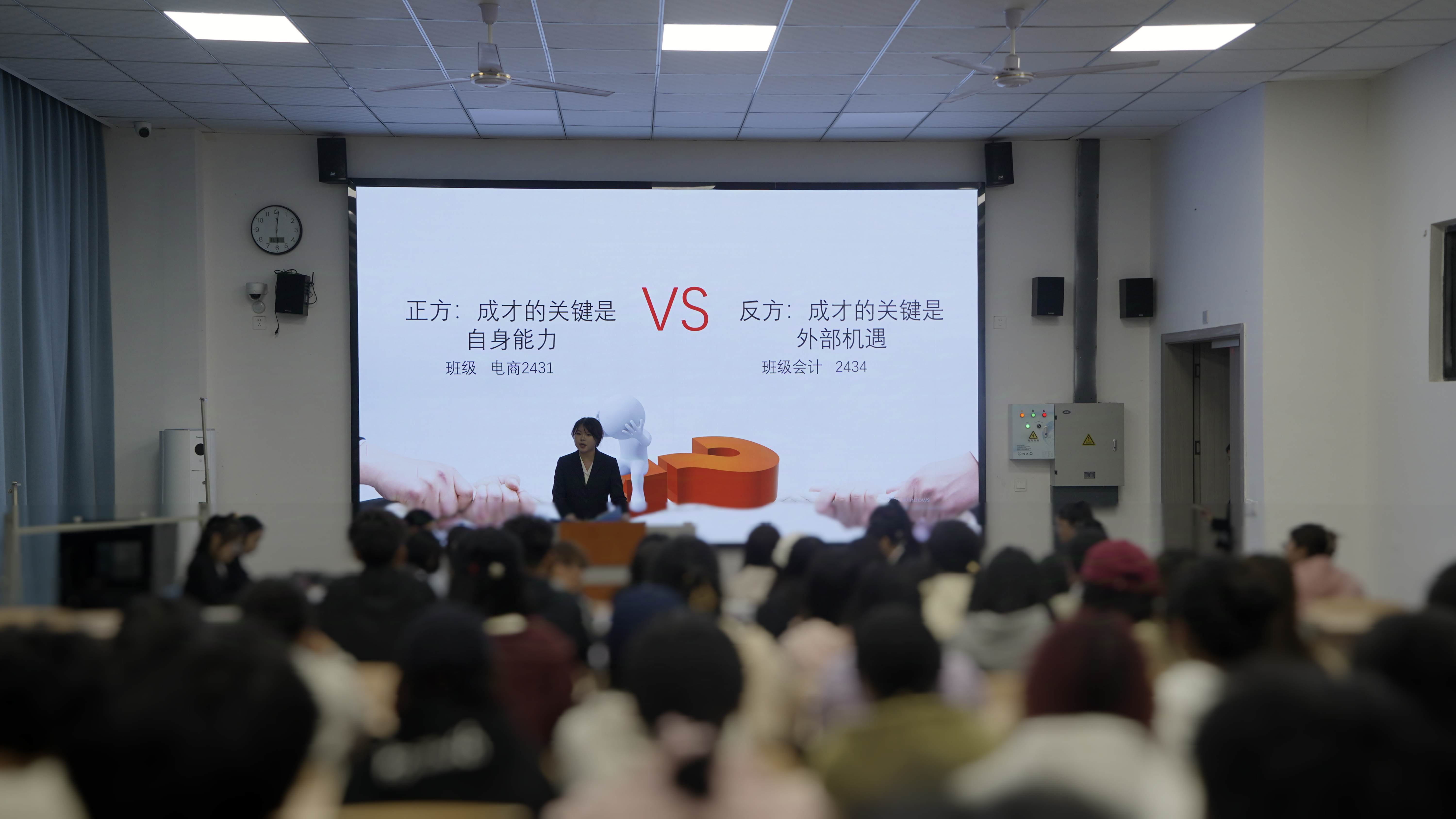 决赛辩题为《成功的关键是自身能力/外部机遇》,比赛过程中,辩手们各抒己见,引经据典,用生动的例子和有力的论据支持自己的观点。他们时而慷慨激昂,时而幽默风趣,赢得了现场观众的阵阵掌声。通过激情辩论让同学们更加深刻地认识到成长成才的复杂性和多样性,无论是自身能力还是外部机遇,都是影响成才的重要因素。应该在注重提升自身能力的同时,也要善于抓住和利用外部机遇,为自己的成长和发展创造更多的可能性。