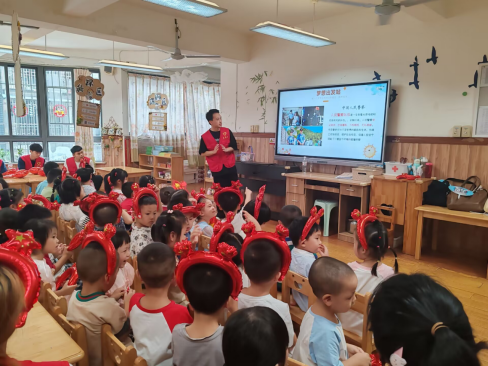 活动开始,同学们分成两个小分队分别去到黄舣镇中心幼儿园中一班、中二班。活动过程中,每个小组都为给小朋友们精心准备了节目和小礼品,志愿者们不仅给小朋友们带去快乐,还穿插着给小朋友们讲解了有关国庆节有关的知识,让他们了解祖国母亲,小朋友们都十分认真地学习着。现场气氛活跃,大朋友、小朋友们积极互动,展现青春活力的同时传递着对祖国的热爱。