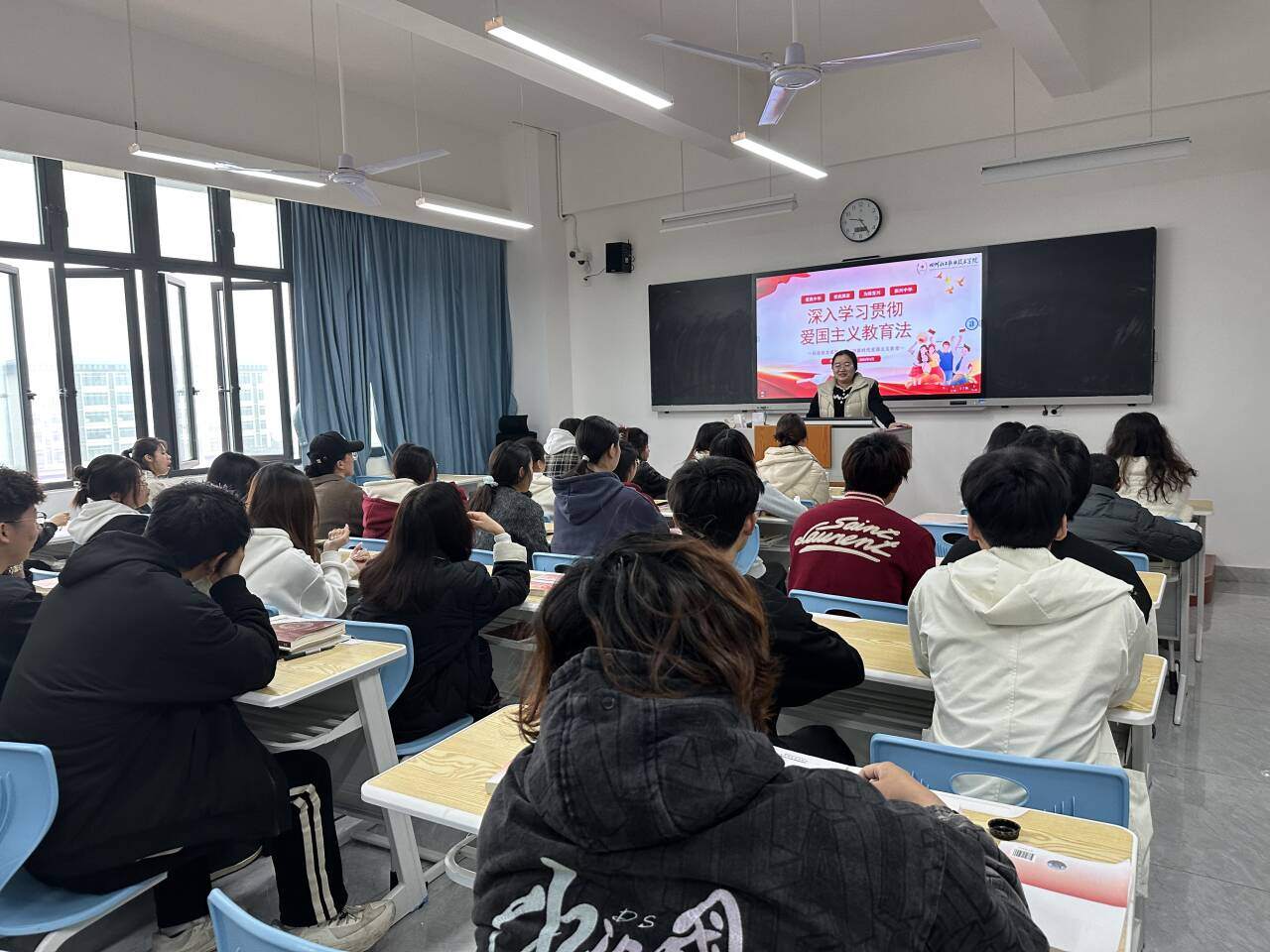 在班会上,各班辅导员带领同学们通过爱国主义教育法的总则、职责职务、实施措施、支持保障等方面,向学生们详细解读了《中华人民共和国爱国主义教育法》的相关内容,并进行了交流和讨论,部分同学也分享了自己的看法和感受。