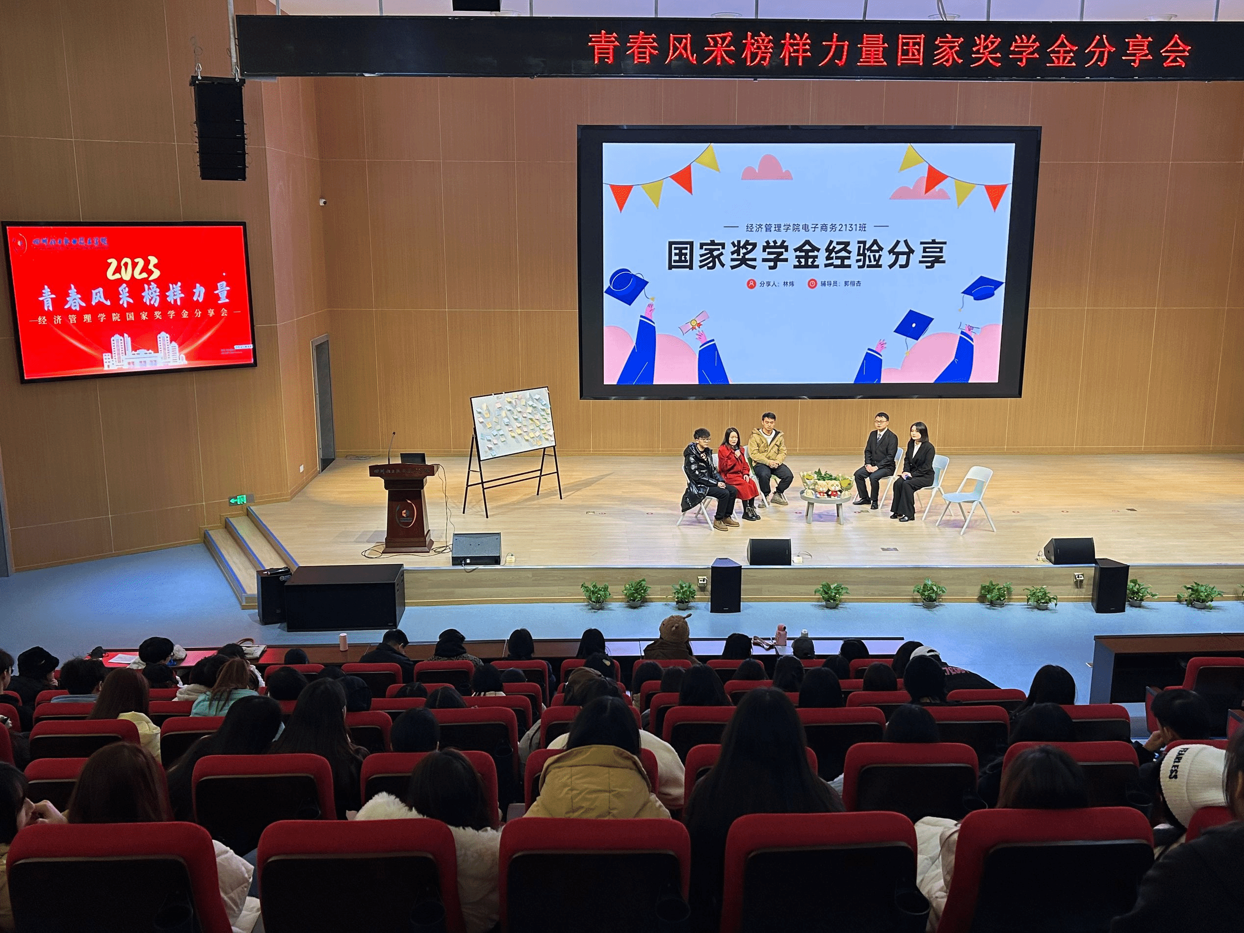 榜样是旗帜,指引前进的方向;榜样是资源,凝聚身边的力量。为更好地发挥榜样的示范引领作用,营造良好的学习氛围,激励广大学子奋发向上,经济管理学院团总支于12月15日在酒谷湖校区醇和楼报告厅成功举办国家奖学金获得者经验分享会。分享会由学院团总支副书记谢耀辉老师主持,并特别邀请电子商务2131班邓丝琴和林炜两位国家奖学金获得者进行经验交流分享,学院2023级辅导员及各班团学干部参加分享会。