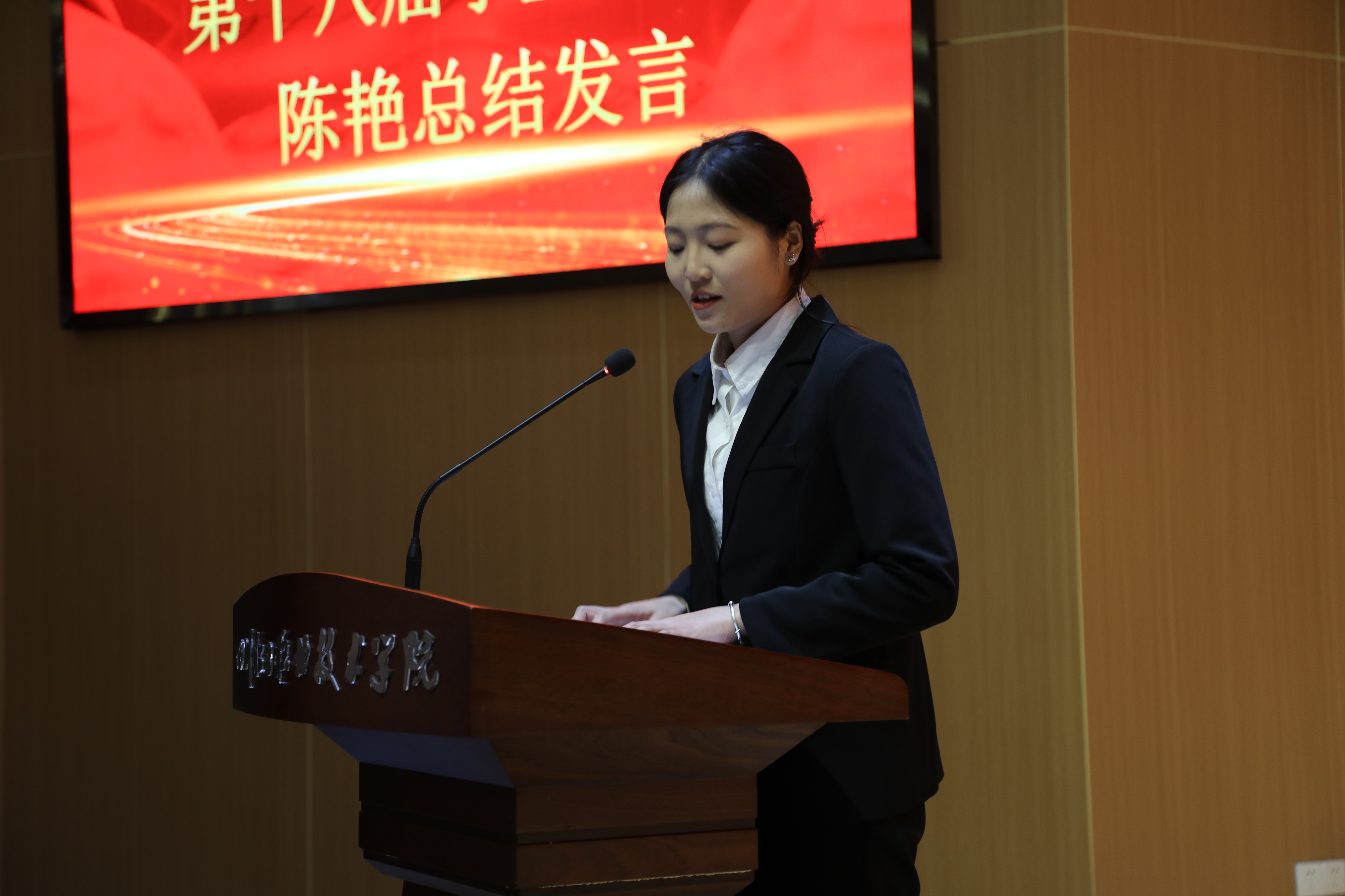 第十八届学生会代表陈艳总结发言。陈艳同学在总结发言中向学院老师们的指导和帮助、各位团学干部在这一年里做出的贡献表示衷心的感谢,对学生会2023年的工作进行了总结。